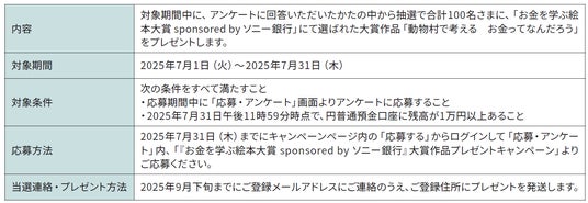 ソニー銀行株式会社(代表取締役社長:南 啓二/本社:東京都千代田区/以下 ソニー銀行)は、2025年7月1日(火)より、「お金を学ぶ絵本大賞 sponsored by ソニー銀行」にて選ばれた大賞作品のプレゼントキャンペーンを実施することをお知らせします。