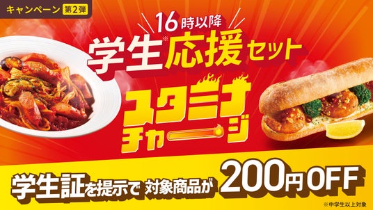 「学生応援セット」は、これから多くの学生が迎える試験期間や夏休みの課題など、集中して作業を頑張りたいときや、就職活動の合間、授業後のアルバイト前などに『カフェ・ベローチェ』でさっとスタミナチャージをしてほしいという思いで企画しました。16時以降の時間帯限定で、レジにて学生証をご提示いただくと、「ガツンと!スタミナチャージフェア」の商品を含む、焼きたてサンド・ドッグ・パスタ・ライスのフードセットメニューを200円引きでご提供いたします。学生向けのキャンペーンは『カフェ・ベローチェ』として初の試みとなります。