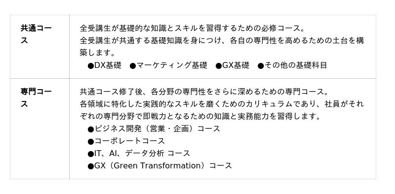 グリーンエナジー大学では、GX(グリーントランスフォーメーション)、DX(デジタルトランスフォーメーション)、マーケティングなど、幅広い分野を網羅したカリキュラムを展開します。社員の多様な成長ニーズに応えるため、以下2つのフェーズに分け、体系的かつ実践的なプログラムを構成しています。