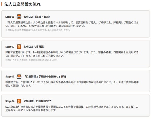 (3)書類審査完了後、法人の登記住所および取引担当者様のご住所宛に「口座開設お手続きのお知らせ」を郵送し、ご住所を確認させていただきます。