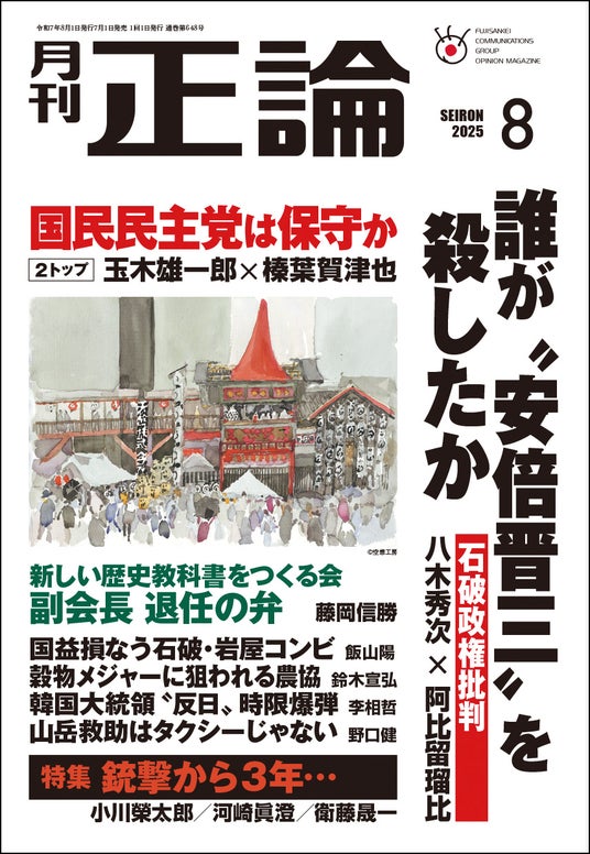 日本の針路を考える論壇誌、月刊「正論」8月号(産経新聞社発行)を7月1日に発売します。特集は「あれから3年…」。奈良市で安倍晋三元首相が銃撃されて死亡した事件から3年。安倍元首相のブレーンとして知られる麗澤大学教授の八木秀次氏と、安倍元首相の最側近記者で産経新聞論説委員の阿比留瑠比氏による対談をはじめ、文芸評論家の小川栄太郎氏、参議院議員の衛藤晟一氏らが寄稿しています。また、イランとイスラエルの戦闘や、韓国で新たに大統領に就任した李在明氏をめぐる話題については、イスラム思想研究者・飯山陽氏や、龍谷大学教授・李相哲氏らが解説しています。