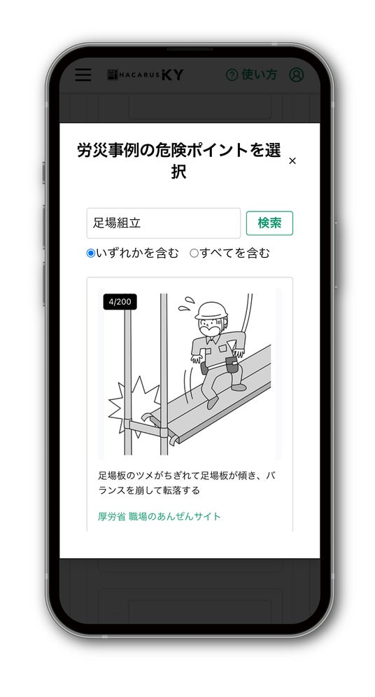 HACARUS KYは、AIが作業内容に応じて自動で労働災害リスク提案を行うことで、経験や知識に依存しないKY活動のデジタル化を支援するアプリケーションです。