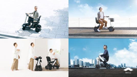 ウィルは免許不要で歩行領域を走行できる近距離モビリティです。うちModel C2は高いデザイン性と5cmの段差乗り越え、後輪を軸にその場で一回転できる小回り能力、リアサスペンションを採用した滑らかな乗り心地などを特長とします(写真右下)。