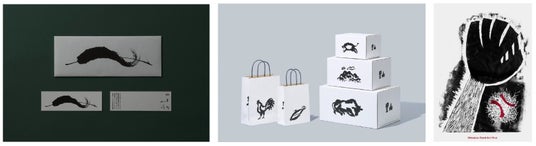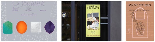 (左)サリーン・チェン:ショップ&ギャラリーの企画展のブランディング「Crystalline」アワフェイバリットショップ、(中央)サリーン・チェン:ショップ&ギャラリーの企画展サイン「UNIQUE PRODUCTS」 アワフェイバリットショップ、(右)サリーン・チェン:ショップ&ギャラリーの企画イベントポスター「WITH MY BAG」アワフェイバリットショップ