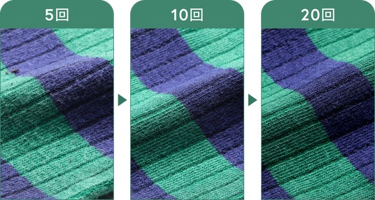 回数を重ねるほどに毛玉や毛羽立ちが除去され、なめらかな質感になり、毛玉や毛羽立ちによる色褪せが軽減しています。