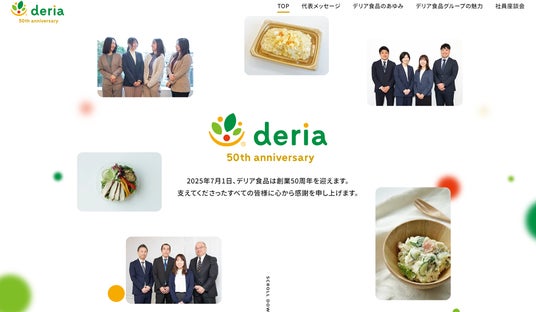 50年の歴史と社員の思い出エピソードなどを通じて企業の歩みを紹介しています。デリア食品とお客様、取引先、地域の皆様といったステークホルダーをつなぐコミュニケーションツールとしての活用を目的としたサイトです。「代表メッセージ」「デリア食品のあゆみ」「デリア食品グループの魅力」「社員座談会」の全4つのコンテンツで構成されています。(https://www.deria-foods.co.jp/50th/)