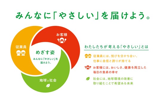 私たちの考える『やさしい』とは、「ストレスのない心地よい幸せな食卓を実現するために(お客様、社会、従業員全てに)心を配り徹底した配慮を行う」気持ちであると考えます。50周年を機に、これまでの歴史を振り返りながら、新たな価値創造に挑戦し続けてまいります。