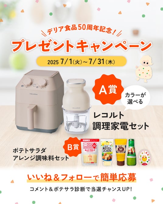7月1日(火)~7月31日(木)まで、デリア食品の創立50周年を記念して、いいね&フォローで素敵なプレゼントが当たるキャンペーンを実施します。
