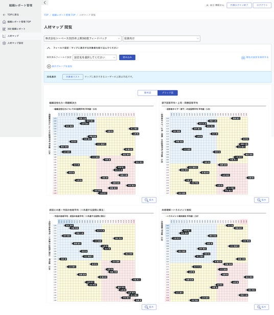 「人材マップ」は、360度フィードバックの結果を組織ごとに可視化する機能の1つで、組織内のスキルや特性の分布傾向を直感的に把握することができる「CBASE360°」の機能です。2024年にリリースしたα、β版では、20社を超える企業の皆様にご利用をいただき、実際のお客様の声をもとに複数の機能拡張を実装いたしました。これまで、個々のフィードバックデータを人材育成やマネジメント層の評価・育成に活用してきた企業が、そのデータを複数の軸による人材群ごとに可視化することで、人事評価や最適配置や次世代リーダー層の育成戦略まで展開できるようになりました。「CBASE360°」ならではの特徴としては、個人のデータを複数の切り口やマップで同時に確認できることが挙げられます。一人ひとりの得意・不得意を多角的に理解することができるため、組織における適材適所をより戦略的に計ることが可能となります。