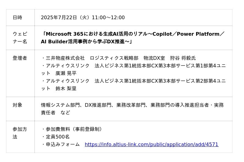 アルティウスリンクは、2024年10月より、三井物産のロジスティクス戦略部に対し、Copilotをはじめとした生成AI活用支援を行っています。Copilot活用領域の特定、Power PlatformやAI Builderとの連携による業務自動化、社内研修の実施など、現場に寄り添った伴走支援を行い業務効率化に貢献。この支援実績を基に、三井物産のご担当者をゲストに迎えたウェビナーを開催します。