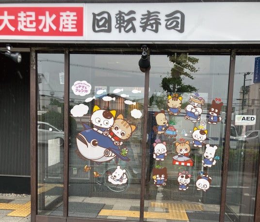 大起水産の店舗の入り口では、「タマ&フレンズ」とキャンペーンオリジナルキャラクター「ダイ」がお出迎えします。