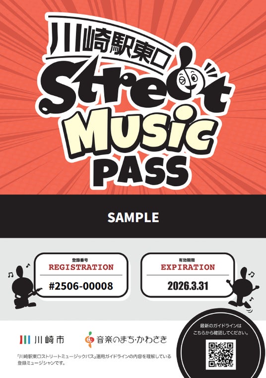 - 「音楽のまち・かわさき」推進協議会ホームページにて登録を受け付け、ガイドライン(別紙)の内容を了承した演奏者に登録証を発行します。- 演奏者や通行者に本取組に親しみを持ってもらうため、本取組の名称と登録証を「川崎駅東口ストリートミュージックパス」とします。