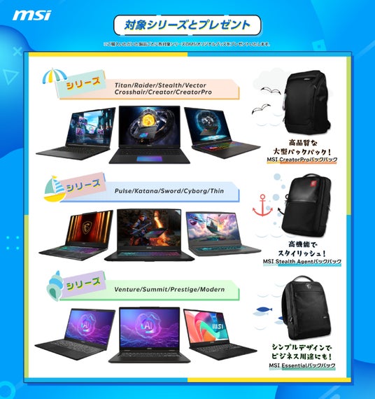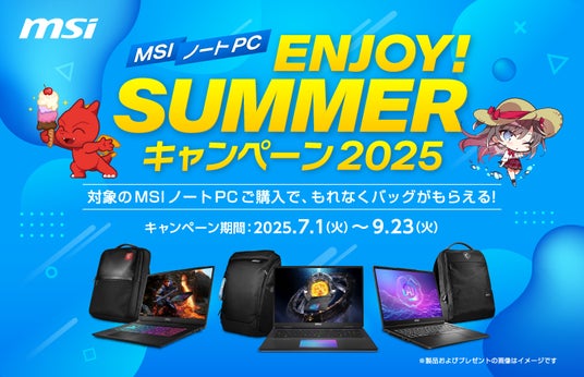 この度、エムエスアイコンピュータージャパン株式会社は、2025年7月1日(火)~2025年9月23日(火)に対象のMSIノートPC製品のご購入でMSIオリジナルグッズが必ず貰える『MSIノートPC ENJOY!SUMMERキャンペーン2025』を開催いたします。