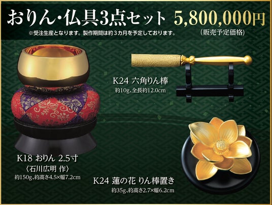 「大黄金展」では、人間国宝が手がけた「黄金のおりん」などの仏具や仏像、定番の大判小判、また暮らしを彩る和洋食器、開運・縁起物の置物など、ご覧いただくだけでも華やかな気持ちになれる金工芸品を1,000点以上、展示、販売いたします。■日常を彩る黄金の食器