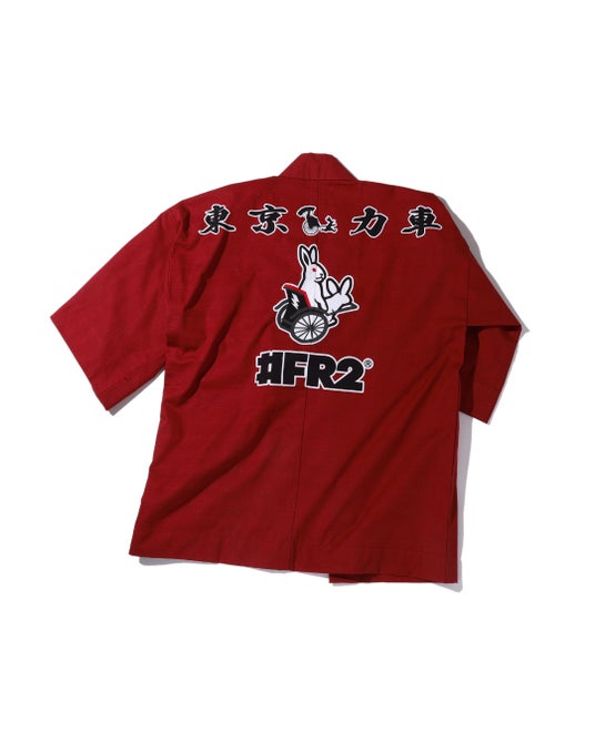 Tシャツは、フロントに「頭狂色情兎」ロゴを刺繍し、バックには「#FR2」の象徴であるウサギのアイコンと人力車を組み合わせた特別なグラフィックを配置。さらに、袖口を折り返すと、「東京力車」のロゴが現れる、遊び心の効いたディテールを加えています。カラーはホワイトとブラックの2色を展開。
