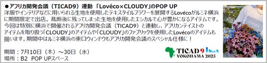 ルミネ横浜では、アフリカ開発会議(TICAD9)と連動した「Loveco ×CLOUDY」のPOP UPや、各ショップのエシカルな取り組みを紹介するキャンペーンを展開します。さらに、レストラン・カフェではキャンドルを灯すライトダウンイベントなど、館内全体でエシカルなライフスタイルを体感できる企画を実施します。