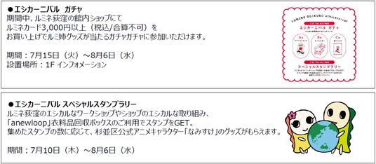 ルミネ荻窪では、約50ショップがエシカルな取り組みを実施します。ルミ姉のグッズが当たる「エシカーニバル ガチャ」の設置やなみすけグッズがもらえるスタンプラリー、魅力的な地域のお店が集まる「よりみちマルシェ エシカーニバル特別編」、杉並区と連携したワークショップの開催、お客さま参加型展示など盛りだくさんです。