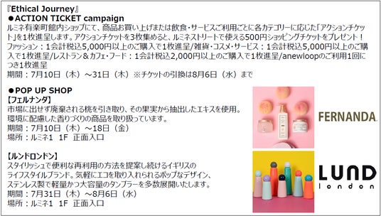 ルミネ有楽町では、身近にあるエシカルな考えや、各ショップの取り組みをご紹介しています。エシカルブランドによるPOP UPの実施や、買い回りでショッピングチケットがもらえるアクションチケットキャンペーンを館内で同時開催!夏らしいビアガーデンイベントも「エシカル」な要素を取り入れた仕様で実施します。都会の中でもリラックスしながらサステナブルに触れられる空間を演出します。