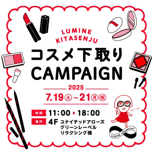今回、「ルミネ新宿」「ルミネ北千住」「ルミネ立川」「ルミネ町田」「ルミネ川越」「ルミネ藤沢」「大船ルミネウィング」の7店舗でコスメ下取りキャンペーンを実施いたします。