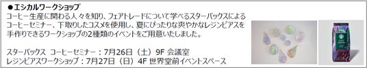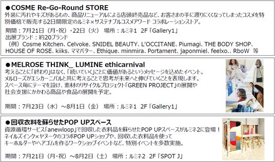 エシカルイベント:LUSHのロージーマスク製造体験、絵本交換イベント、靴下屋のワークショップ、クローゼットに眠っているアイテムを活かして新たな着こなしを発見するコーディネート提案イベント(ONE LUMINE事前予約制)、コスメ下取りキャンペーン 等