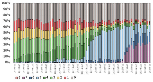 分析結果によると、2019年初旬は3種(図表の黄緑部分)の検査項目数が一般的でしたが、2022年に5種(図表の水色部分)、2023年に7種(図表の紫色部分)の検査項目が増えています。直近では7種の検査項目が検査全体の3分の1程度に達しています。分子標的薬およびそのマルチプレックス・コンパニオン診断検査の充実化が寄与していると考えられます。