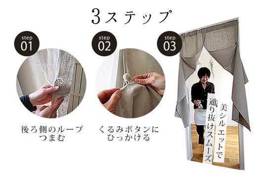 プロジェクトタイトル:開けたまま固定できる通り抜けスムーズなドアカーテン リネン100%でドレスアップ