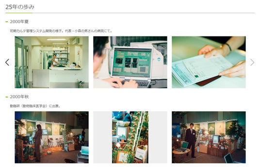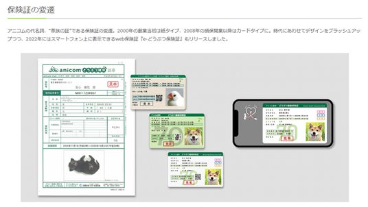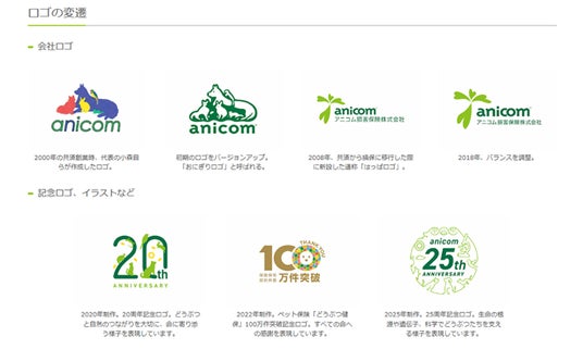 25周年記念ページでは、2000年共済創業時から現在に至るまでのロゴやイラストの歴史、アニコム損保のペット保険の象徴であり“家族の証”でもある「どうぶつ健康保険証」の変遷、そして25年間の歩みを写真とともにご紹介しています。