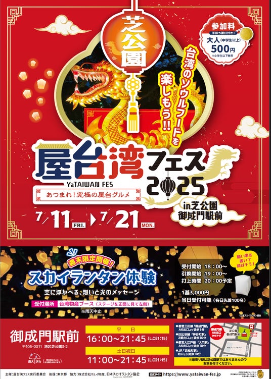 2025年7月11日(金)から21日(月・祝)まで、東京・芝公園にて「屋台湾フェス2025 ~あつまれ!究極の屋台グルメ~」を開催いたします。本イベントは、台湾の本場屋台グルメや雑貨、音楽、スカイランタン体験など、台湾旅行気分を味わえる11日間の祭典です。