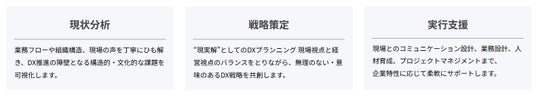 企業のDXを進めるには、現場のリアルな課題を見つめ直し、実行可能な戦略に落とし込むプロセスが欠かせません。「現状を正しく把握すること」「意味ある戦略を描くこと」「無理のない実行支援を行うこと」に重きを置き、企業のDX推進を力強く後押しします。