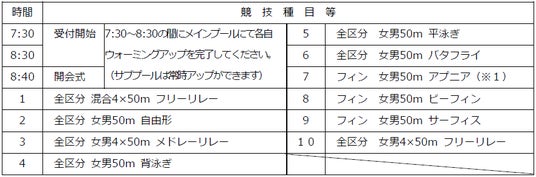 大会プログラム(予定):※各種目タイム決勝(レースは、エントリータイム順によるタイム決勝とします。)