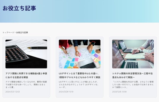 開発にあたって知っておきたい知識やトレンドなどを記載した「お役立ち記事」や、実際に自社での開発や外部に開発を依頼する際に活用できるワークシートなどの「お役立ち資料」を掲載させていただいております。