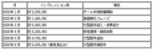 売れるネット広告社グループ株式会社(本社:福岡県福岡市、代表取締役社長 CEO:加藤公一レオ、東証グロース市場:証券コード 9235、以下 売れるネット広告社グループ)は、連結子会社である売れるネット広告社株式会社が2025年1月より本格稼働した運用型広告事業において、『LINE・Google・Meta・Yahoo!・TikTok』との“運用広告連携”により、広告配信量(インプレッション数)が計画を大幅に上回るスピードで拡大し、2025年6月末時点で累計3,500万インプレッションを突破する見込みとなりました。