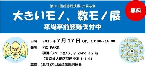 (公財)大田区産業振興協会(本社:東京都大田区、理事長:川野正博)は、微細加工や少量多品種で名高い大田区産業のイメージとは一線を画す、「大モノ部品の加工」や「量産技術」をテーマに超専門技術ミニ展示会「大きいモノ、数モノ展」を7月17日(木)に開催いたします。