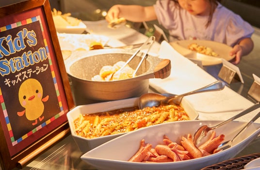 7月19日(土)から8月31日(日)までの夏休み期間は、お子様専用の「キッズステーション」をご用意。オムライスやから揚げ、ハンバーグなど、お子様に人気のメニューを並べるほか、お好みのフルーツやマシュマロで楽しむチョコレートファウンテンや、カップいっぱいのキャンディープレゼントといった楽しいコーナーを設けます。