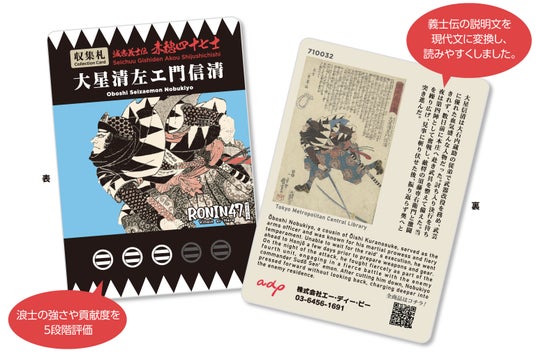 「四十七士収集札」として全浪士のトレーディングカードを作成。浪士一人一人は強さや討ち入りの貢献度も異なります。それらを当時の資料をもとに、AIによる分析で5段階評価し、カードで表現しました。裏面には『誠忠義士伝』に印刷された文章をAIが現代文に変換。当時庶民に親しまれた物語を、現代のユーザーにも読みやすくしました。