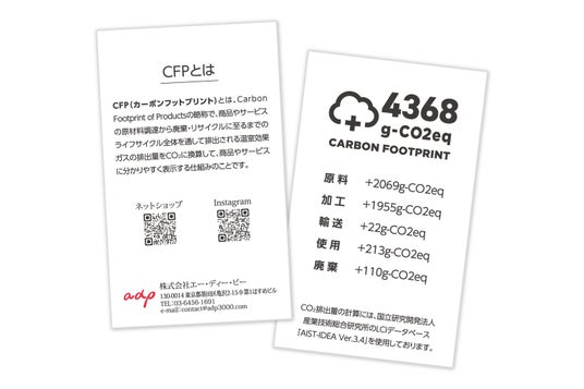 国立研究開発法人 産業技術研究所のLCIデータベース「AIST-IDEA Ver.3.4」を使用し、CFP計算を自社で行っています。誠忠義士伝 赤穂四十七士Tシャツの全商品にCO2排出量を表示しています。