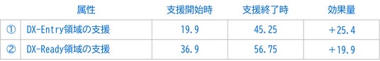 ■過年度の事業では、支援対象企業を1.DX-Entry領域と2.DX-Ready領域に分類し、DX診断を活用して 進捗の中央値を分析しました。その結果、開始時と終了時のDX進捗度には明確な差が見られ、特にDX-Ready領域に分類された企業では、すでに一定のデジタル化が進んでおり、そこからさらに利活用の高度化や新たな施策の展開につなげる支援が行えたことが明らかとなりました。