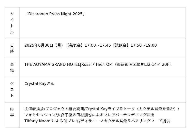 この夏、イタリアのアマレットリキュール「ディサローノ(Disaronno)」がブランド生誕500周年を迎えるにあたり、株式会社ウィスク・イー(本社:東京都千代田区 / 代表取締役社長 遠山公隆)は、『Disaronno Summer Project 2025』を関東各地で展開いたします。その幕開けとして、報道関係者様を対象としたプレスイベント「Disaronno Press Night 2025」を2025年6月30日(月)に開催いたしました。
