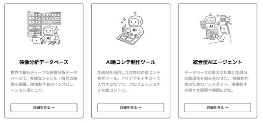 膨大な映像データと生成AIを組み合わせ、企画段階から絵コンテ作成までを高速化する “映像制作サポートプラットフォーム” です。