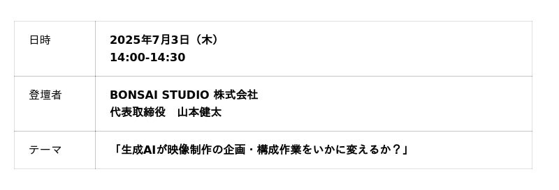 当社ブースでは 『CINEMATICA β版』 のライブデモに加え、研究開発領域向けの映像制作・ライブ配信など BONSAI STUDIO のプロダクションワークを併せて展示し、来場者の課題に応じた導入相談を承ります。