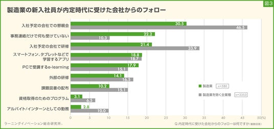 製造業の新入社員は他業種より不安な気持ちが強いことがわかりましたが、それは内定時代に受けた会社からの働きかけが影響しているかもしれません。そこで、内定時代に会社からどのようなフォローがあったか質問しました。結果、「入社予定の会社での懇親会」と回答した割合が30.5%と最も高く、次に「事務連絡だけで何も受けていない」が22.2%と続きました。1位だった「入社予定の会社での懇親会」は、他業種より16.0ポイント低い結果となりました。一方、2位の「事務連絡だけで何も受けていない」は他業種よりも11.9ポイント高くなりました。製造業は他業種に比べて、内定時代の新入社員へのフォローが手薄であった実態が明らかとなりました(図3)。
