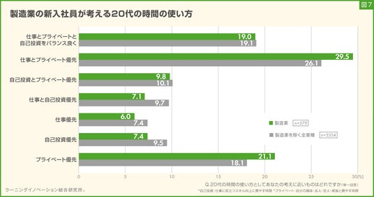 次に、20代の時間の使い方について、「仕事」「プライベート」「自己投資」3つの理想のバランスを質問したところ、「仕事とプライベート優先」「プライベート優先」の割合が他業種よりも高く、2割以上が回答しました。この結果から、製造業の新入社員はプライベートの時間を大切にしたいと考える割合が高い特徴があることがわかりました(図7)。