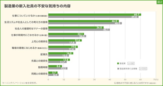 不安な気持ちの内容を質問したところ、6割以上が「仕事についていけるか(仕事の難易度)」と回答しました。次に、「生活リズムや社会人としての考え方の習得」が46.0%、「社会人の基礎的なマナーの習得」が36.0%と続きました(図2)。