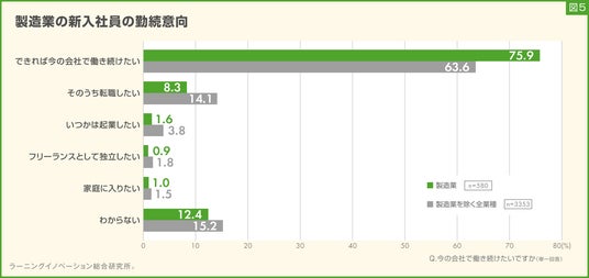 まず、現在の会社で働き続けたいかと質問したところ、「できれば今の会社で働き続けたい」と回答した割合は75.9%となりました。その割合は他業種よりも12.3ポイント高く、製造業には勤続意向の高い新入社員が多いことがわかります(図5)。
