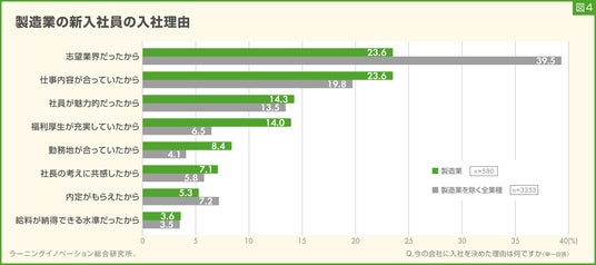 次に、新入社員が今の会社に入社を決めた理由は何だったのでしょうか。入社理由を質問したところ、「志望業界だったから」「仕事内容が合っていたから」と回答した割合がどちらも23.6%で、1位になりました。特に「志望業界だったから」と回答した割合が、他業種より15.9ポイント低くなったことは特徴的です。一方、「福利厚生が充実していたから」「勤務地が合っていたから」の項目は他業種より高くなりました(図4)。