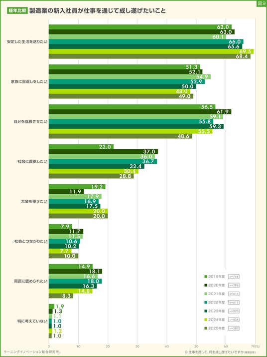 製造業の新入社員が仕事を通して成し遂げたいことについて、2019年度から7年間、各年度の新入社員の回答結果を比較しました。