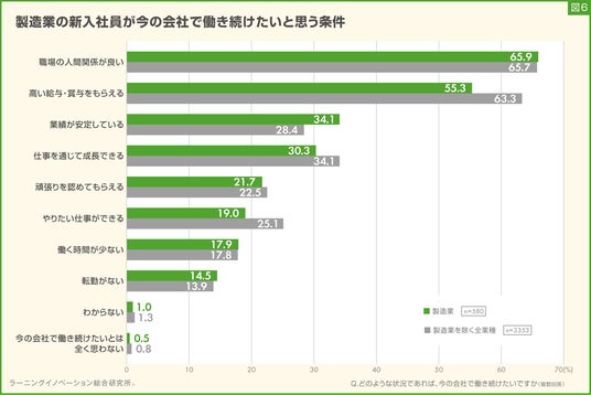 次に、どのような状況であれば、今の会社で働き続けたいか、条件を質問しました。結果、「職場の人間関係が良い」と65.9%が回答し、最大となりました。次に、「高い給与・賞与をもらえる」が55.3%と続きました。また、「業績が安定している」は、他業種より5.7ポイント高い34.1%となりました(図6)。