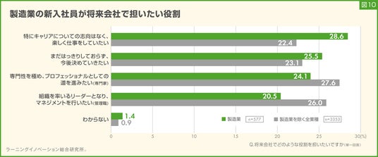 最後に、将来会社でどのような役割を担いたいか質問したところ、「特にキャリアについての志向はなく、楽しく仕事をしていたい」と回答した割合が28.6%、「まだはっきりしておらず、今後決めていきたい」が25.5%と続き、どちらも他業種よりも高い結果となりました。半数以上の新入社員が、今後のキャリアについての考えが不明確であることが判明しました。一方、「専門性を極め、プロフェッショナルとしての道を進みたい(専門家)」「組織を率いるリーダーとなり、マネジメントを行いたい(管理職)」と回答した割合は、他業種より低い結果となりました(図10)。