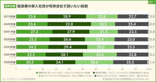 製造業の新入社員が将来会社でどのような役割を担いたいかについて、2019年度から7年間、各年度の新入社員の回答結果を比較しました。
