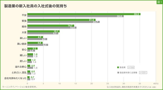 初めに、2025年度の新入社員は、どのような気持ちで入社したのか質問しました。入社式を迎え、気持ちを聞いたところ、製造業の新入社員は、「不安」と回答した割合が35.5%と、最も高くなりました。この割合は、他業種の新入社員より5.5ポイント高くなりました(図1)。